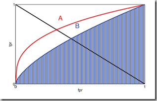 红线A与蓝线B分别表示了两个不同分类器的TPR-FPR曲线(即ROC曲线)。曲线上任意一点都对应了一个threshold 。该曲线具有如下特征: